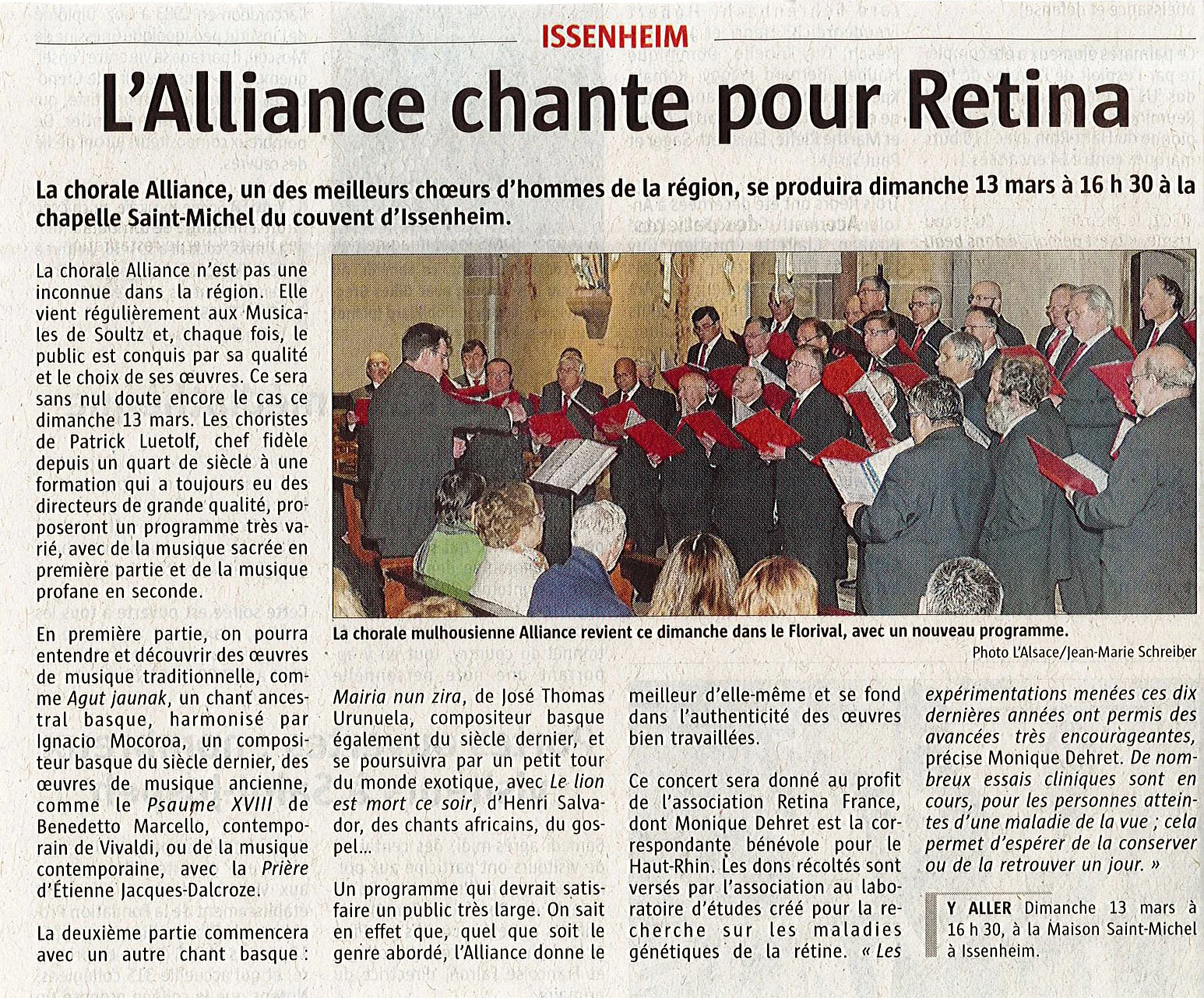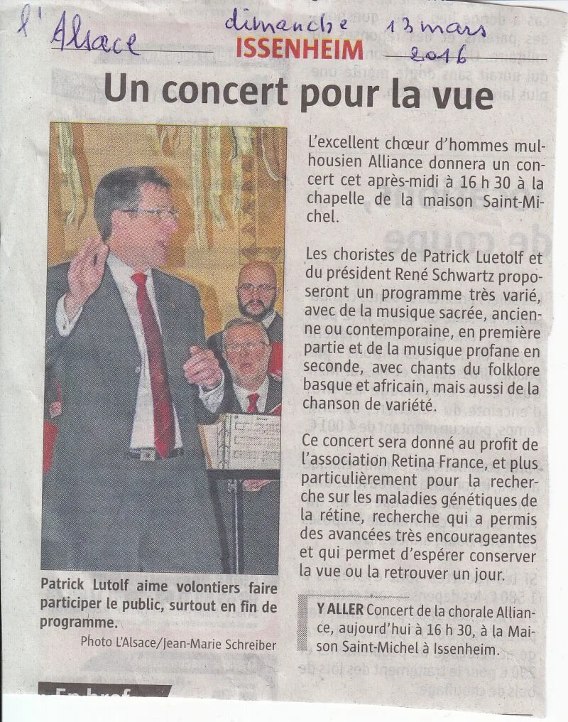 Sur invitation de Rétina France, nous donnerons un concert en la chapelle St Michel à Issenheim le 13 mars à 16h30.