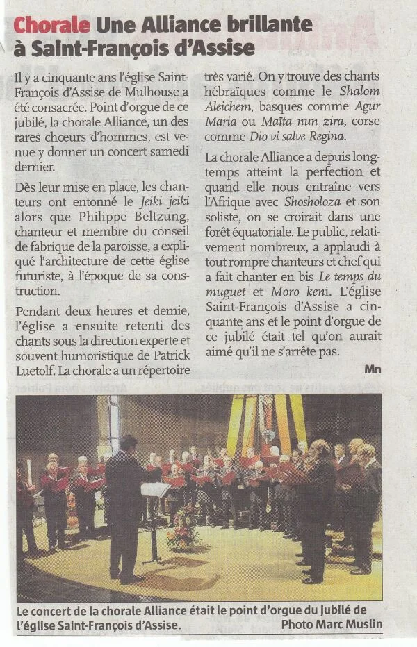 A l'occasion de ce cinquantième anniversaire, et en point d'orgue après la commémoration de cette consécration dimanche dernier 11 mai 2014 présidée par Monseigneur Christian KRATZ, le Conseil de Fabrique est très heureux de la venue de la chorale Alliance, chœur d'hommes de Mulhouse sous la direction musicale de Mr. Patrick Luetolf et la présidence de Mr. René Schwartz dans notre église pour ce concert du JUBILE.