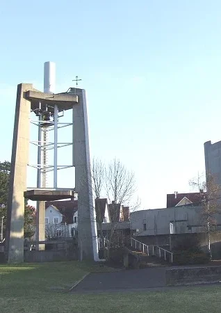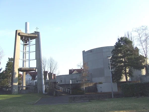 Une église résolument moderne, voire futuriste à l'époque de sa construction a été conçue et construite par l'architecte suisse Hermann BAUR qui l'a voulue pleines de symboles, et la réalisation des vitraux a été confiée à un artiste verrier GORKHUF.