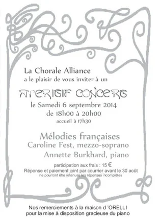 Nous vous informons que la Chorale ALLIANCE organisera un ''Apéritif Concert'' le Samedi 06 septembre 2014 de 18 à 20 h au Chalet , Chemin des Cadets à Mulhouse. Nous ne chanterons pas, une fois n'est pas coutume, mais nous vous invitons à écouter un concert qui sera donné par Caroline FEST...